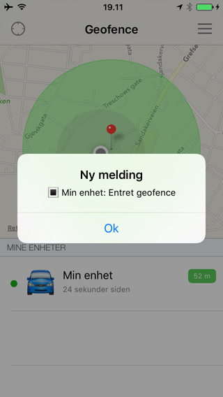 For å sette geofence på trykk på meny valget "Sett geofence PÅ". Mobil applikasjonen tar da kontakt med geofence systemet for å sette geofence på for valgt enhet. Når aktiveringen av geofence er vellykket vil du få en melding om at geofence er skrudd på.