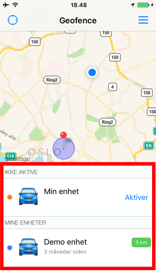 Hvis det er første gang du ser mobil applikasjonen vil du se 2 lister. En over inaktive enheter og en med en demo enhet. Listen inneholder informasjon om hvilket navn som er satt på GPS-enheten, hvor lenge siden enheten sist var i kontakt med systemet og hvor langt unna nåverende posisjon enheten befinner seg. For å aktivere en enhet trykker du på "Aktiver" knappen på for den aktuelle enheten.