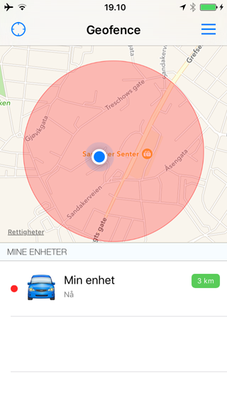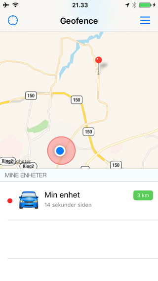 Når enheten har beveget seg utenfor geofence og alarmen har gått vises en rød ring for geofence område.